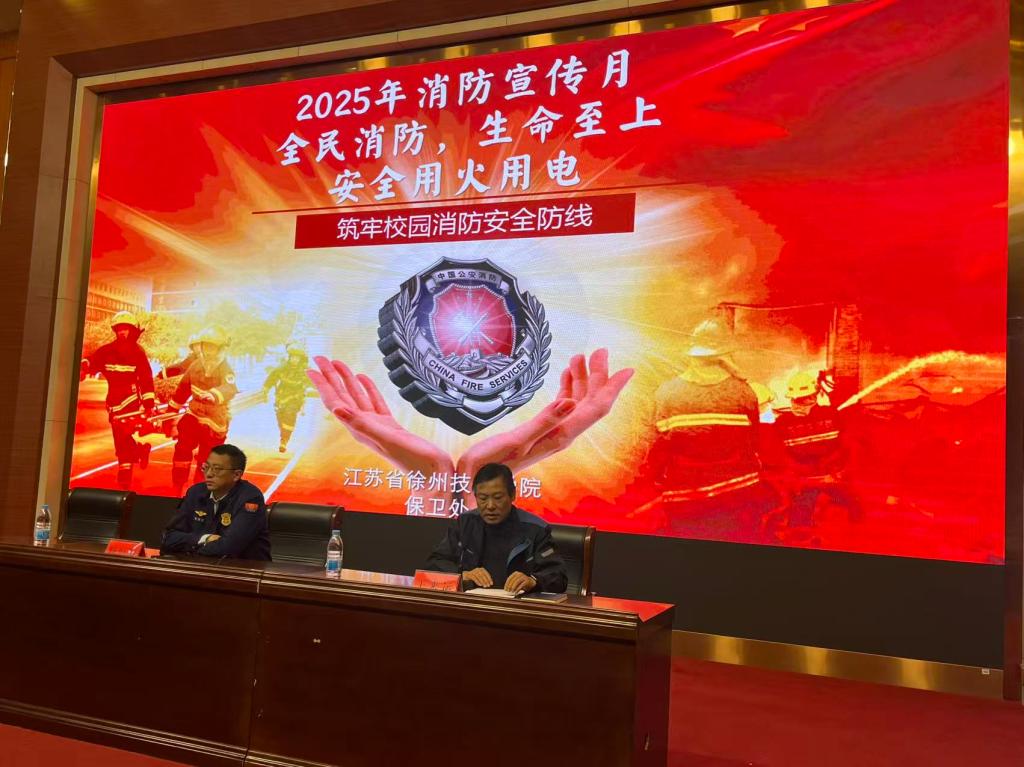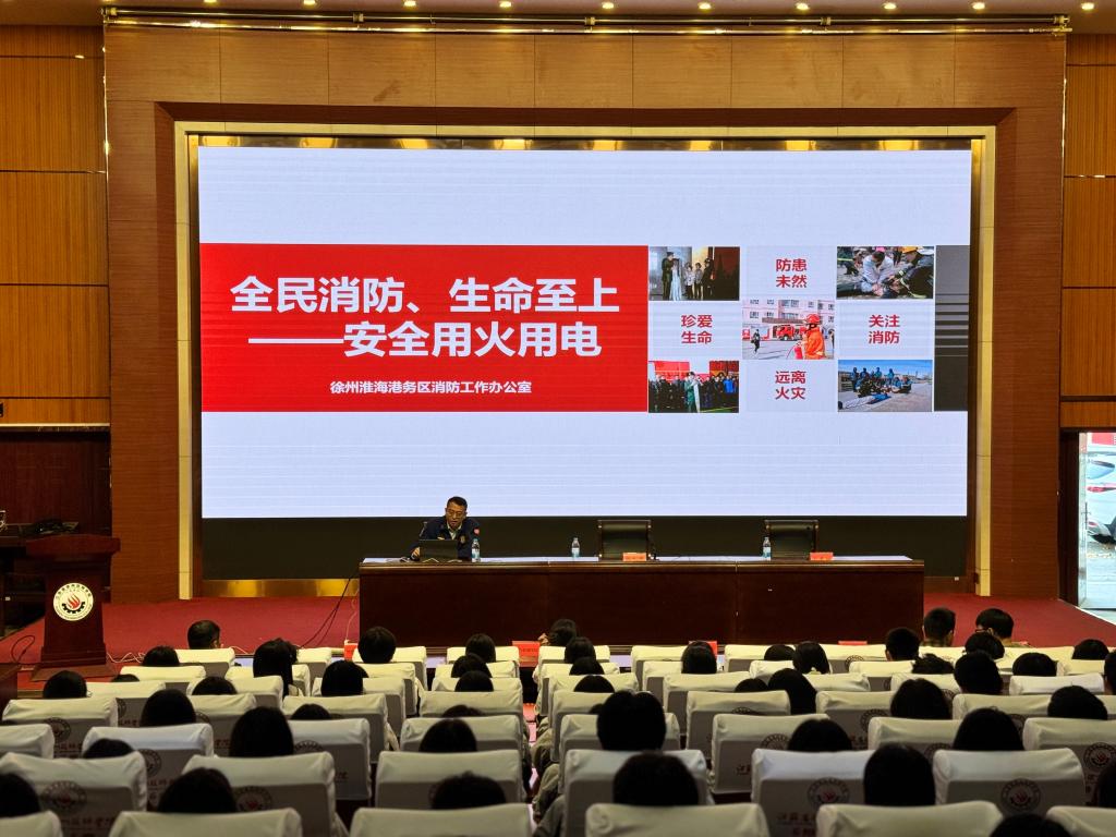 11月5日,徐州市淮海国际港务区消防办公室杨恒鉴参谋一行三人来我校开展消防知识专题讲座。我校新入职教师、新生代表、总务处及服务外包单位员工聆听讲座。