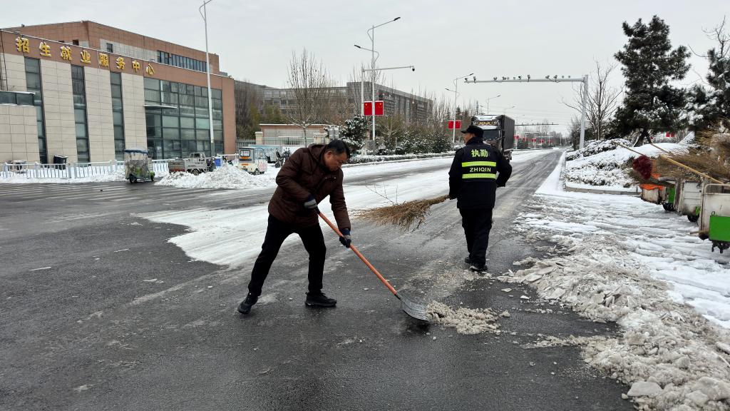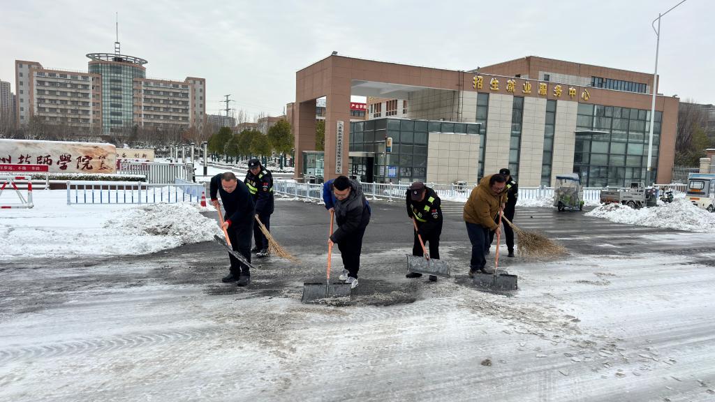 1月20日上午,保卫处处长林文武带领全体工作人员及保安队员开展积雪清理工作。在持续一天一夜的强降雪后,工作人员不畏-10℃的寒冷,手持除雪工具对校门周边区域进行全面清扫,确保教职工安全通行,消除道路交通安全隐患。